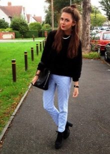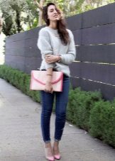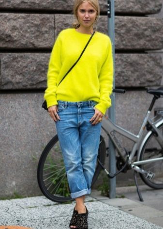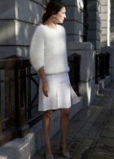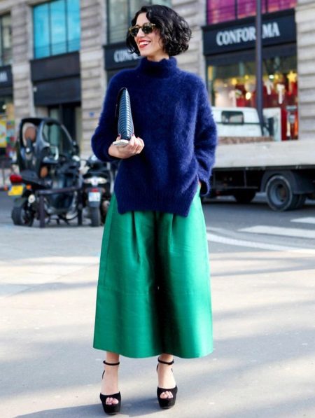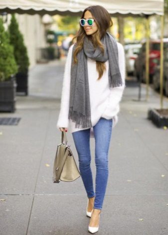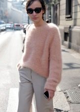 A less extravagant, but no less popular option is an elongated fluffy sweater up to the middle of the thigh or slightly lower. As a rule, a voluminous, straight or slightly fitted cut sweater goes well with tight jeans or trousers, a short straight skirt or even shorts.