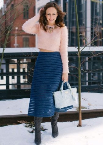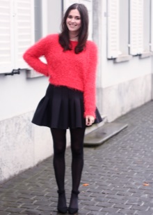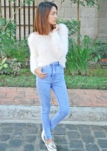 Another hit of the season - a short fluffy sweater. It is worn over a turtleneck, shirt or worn on a naked body.The latter option is perfectly combined with denim shorts, flared skirts or tight jeans.