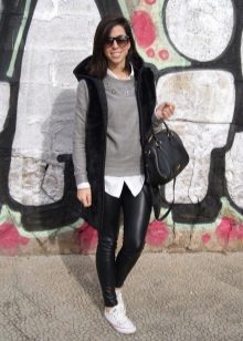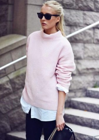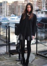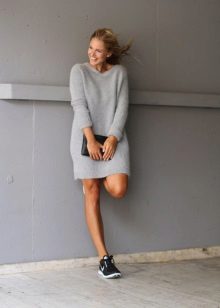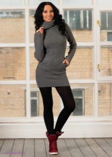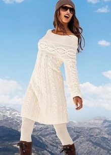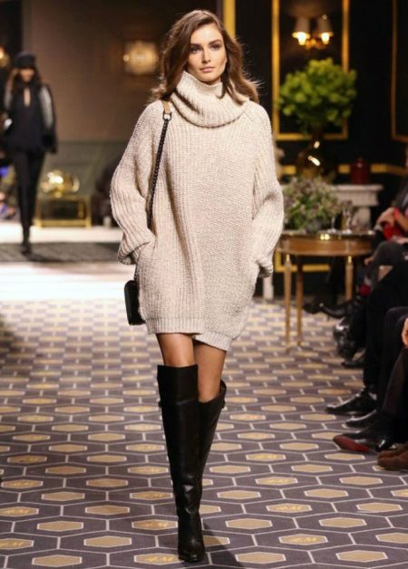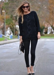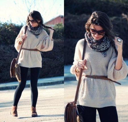An extended sweater is more like a dress or tunic. The ideal combination with a sweater of this type will be leggings and leggings, and you can add completeness to the image and emphasize the figure with the help of a thin or wide belt at the waist.