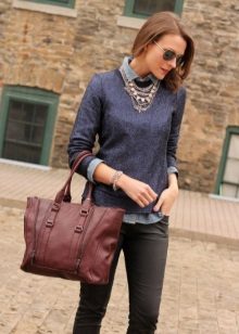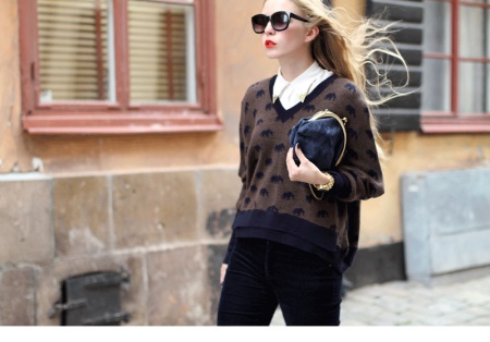 - Pay attention to the neckline of the sweater.For the collar of an office blouse, a round neck is suitable. With a V-neck, the wide collar of the shirt looks great, while the edges of the lapel must be placed on top of the pullover.
