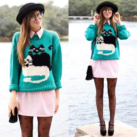 Well, a bright jumper with an unusual print, complemented by an original hat, a small handbag, thin nylon tights and stilettos in combination with a fashionable dress, will make you feel easy and relaxed and will cheer up not only you, but also those around you.