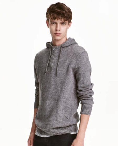 - Men's gray sweater with a hood from H&M. Button-necked model with drawstring and spacious kangaroo pocket made from 100% cotton.