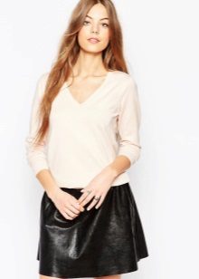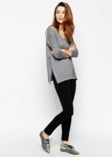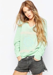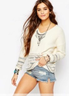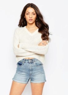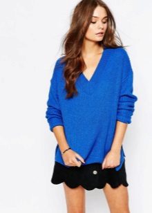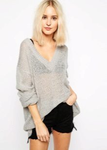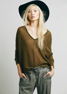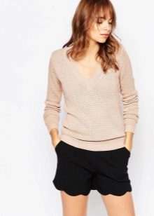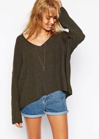 As for the bottom of the outfit, here you can give free rein to your imagination. A sweater with an inverted triangle neckline will perfectly combine not only with trousers and skirts of different styles, but also with romantic dresses and shorts made of thick materials.
