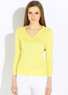 - A fitted sweater with a shortened sleeve by United Colors of Benetton. In addition to light lemon colors, the range also includes models of blue, beige, light lilac, emerald and terracotta colors.