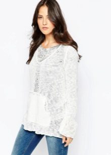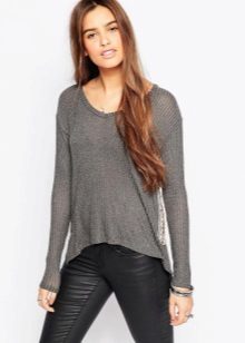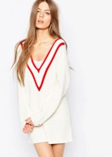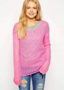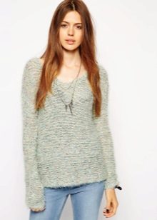 To emphasize a beautiful neck and draw attention to the chest, wear a chain with an original pendant or necklace to such a sweater. Also, a thin scarf, a neckerchief or tie can do this task well.