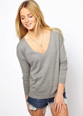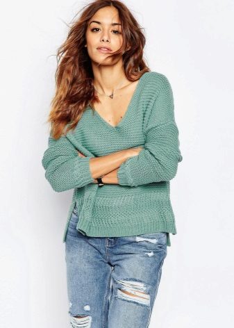 In addition, a sweater with an inverted triangle neckline can narrow your shoulders, so girls with a slender physique with such clothes should be careful. But broad-shouldered fashionistas, this effect, for sure, will appeal to. It should also be noted that the V-neck favorably emphasizes the chest, regardless of its size.