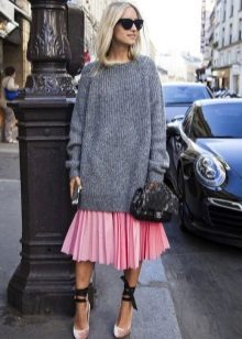 To create a romantic look, a woolen sweater is worn over a midi-length warm dress.