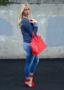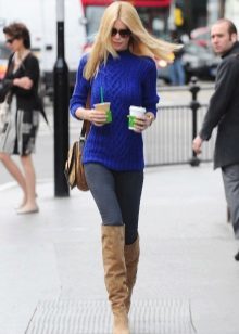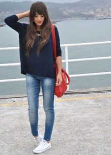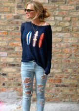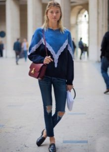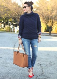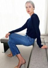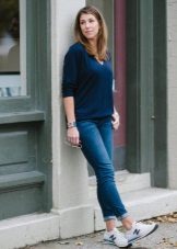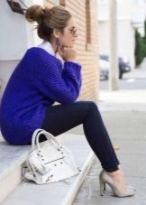 To create a stylish bow in casual style, a blue sweater can be combined with jeans of both narrow and wide cut.