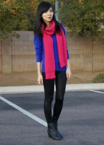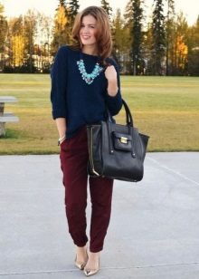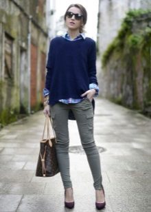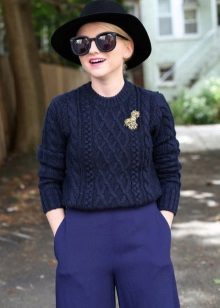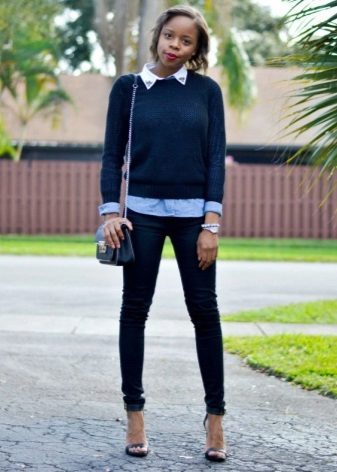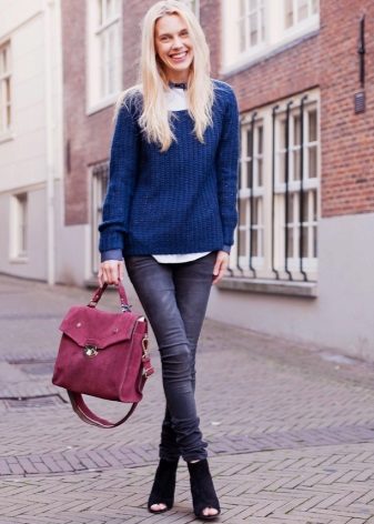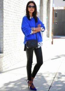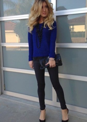 Black trousers can be worn with voluminous blue sweaters, while it should be borne in mind that with a voluminous top, the bottom should be narrow. A great addition will be shoes with high or medium heels.
