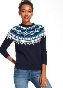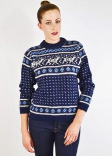 To diversify the blue sweater and add new colors, many models use tight knitting, braids, unusual patterns or ornaments.