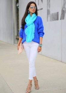 To create an everyday look, you can combine a blue loose fit sweater with white trousers. Elegant decoration on the neck will give the bow sophistication and originality.