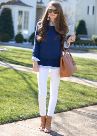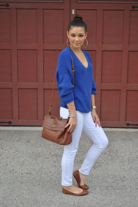 A blue sweater with a V-neck in tandem with white skin-tight jeans will look impressive and stylish. Brown accessories will add feminine charm and appeal.