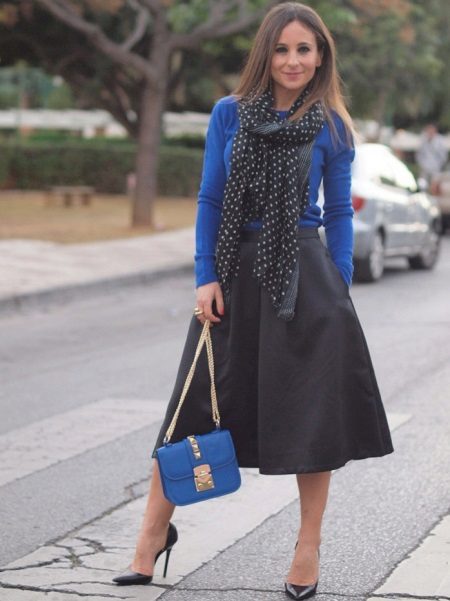 A blue sweater looks elegant and feminine in combination with a black flared midi skirt. Stiletto heels to match the skirt will add sophistication to the look. Luxurious black scarf in white peas will be a great decoration. A stylish clutch bag to match the sweater will help to complete the look.