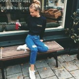 The perfect pair is a black sweatshirt with blue jeans and sports shoes. It can be sneakers, sneakers, moccasins or ankle boots.