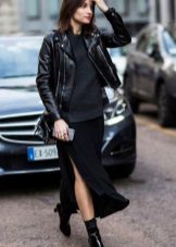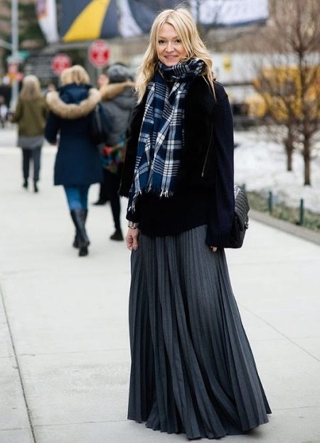 A black sweatshirt in tandem with a maxi skirt of gray color looks spectacular. A bright accent is a warm scarf in a cage. Even with strong winds, you will feel warm and comfortable. A great addition will be a small black handbag.