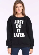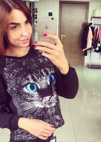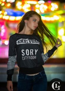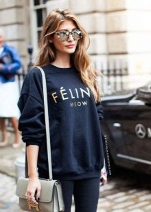 Designers experiment and offer new styles for everyone's favorite sweatshirt. Depending on the type of figure and personal preferences, the girl can choose a model of loose or fitted cut. Black sweatshirts with a short sleeve look unusual. Elongated models are ideal for the cold season, but in spring or autumn you can wear a short sweatshirt in combination with a miniskirt or short shorts.