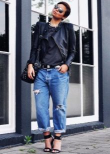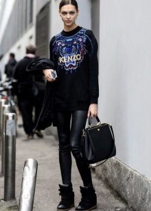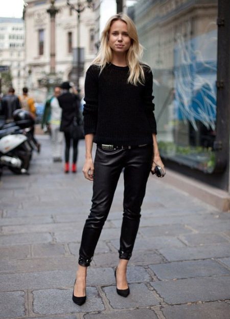 The all-black bow looks beautiful and stylish. A sweatshirt can be combined with leather pants of a tight-fitting cut and elegant high-heeled shoes. In this outfit, you can go both to work and to a party.