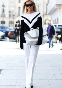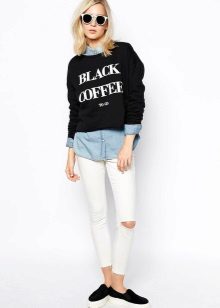 A black sweatshirt can be combined with different wardrobe elements, but be careful in combining colors. The classic tandem is black and white. A black sweatshirt can be worn with white skirts or trousers.
