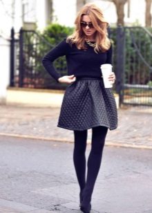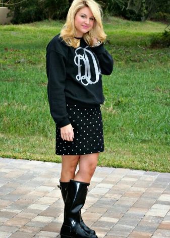 A black sweatshirt with an inscription in white combined with a short pleated skirt and black ankle boots looks bright and unusual. It is worth paying attention to accessories - a small handbag, watch or glasses perfectly complement the irresistible bow.