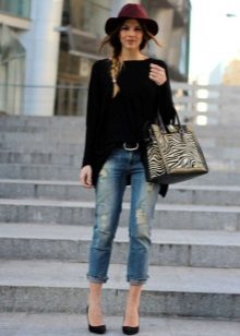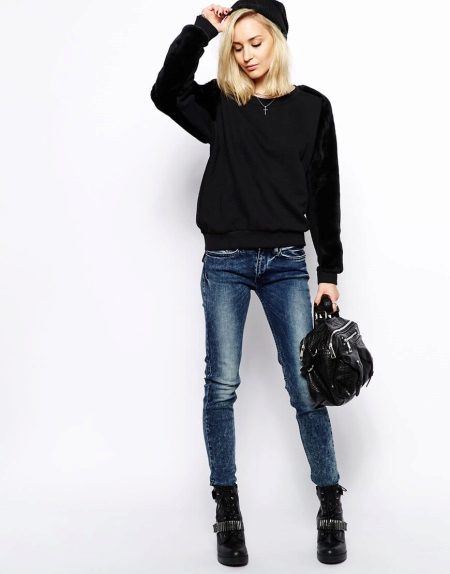 To create a casual look, pay attention to the combination of a sweatshirt with jeans. A black sweatshirt with velvet accents looks original and bold. High berets, a bag and a knitted hat in tone with a sweatshirt perfectly complement a slightly brutal, but at the same time feminine image.
