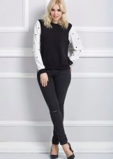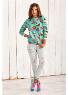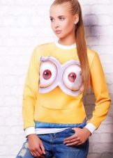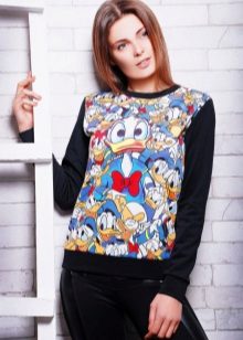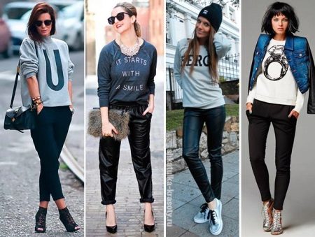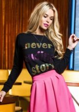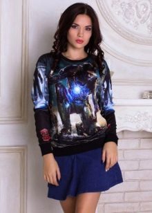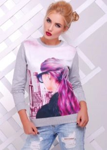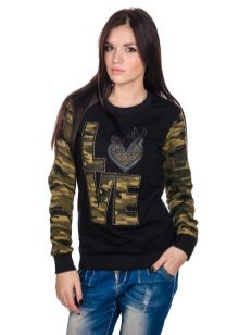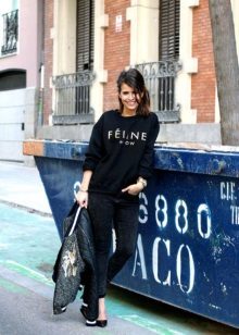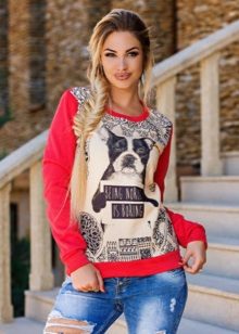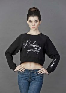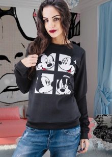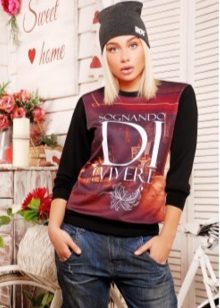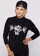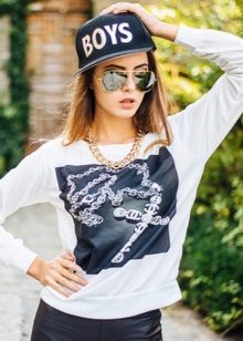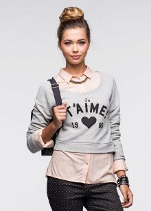 The specifics of sweatshirts also apply to decoration. On some models, these are hoods or pockets, on others, sequins and rhinestones. The obligatory part is a wide elastic band on the sleeves and the belt. One of the main signs is bright prints and inscriptions. Previously, the sweatshirt was intended only for sports, now it has no restrictions.