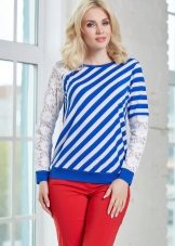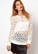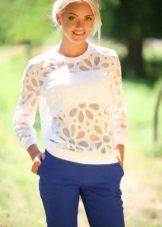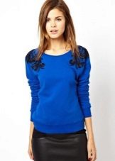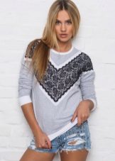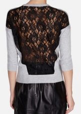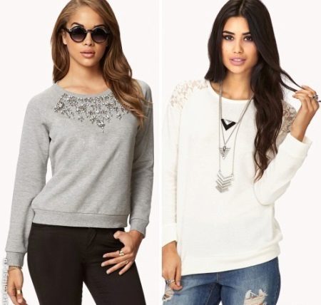 Lace, on the contrary, brings tenderness and softness. They may be present on the product as patches on the shoulders, sleeves, stomach or any other part. And they can be completely or partially, for example, on the back, replaced by lace patterns. Often from the sweatshirt there are only elastic bands on the sleeves and the belt.