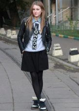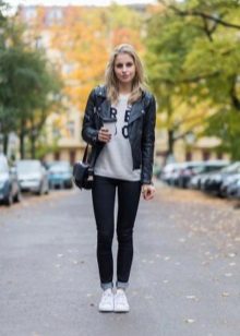 Cheeky sports: sports breeches in the tone of a sweatshirt, gym shoes, and on top a leather jacket.