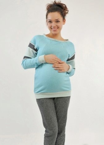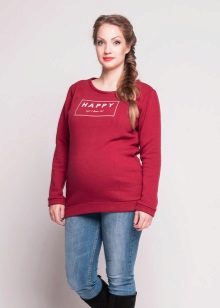 First of all, clothes for expectant mothers should be comfortable and practical. Sweatshirts do not emphasize the tummy, as some pregnant women like, but they have many other advantages. They are soft and comfortable, they have no fasteners and they are easy to put on and take off. Most importantly, a correctly selected model will not be pulled to the chest or tummy, which means nothing will harm the baby. In addition, these clothes will not constrain movements and will warm in the cool season.