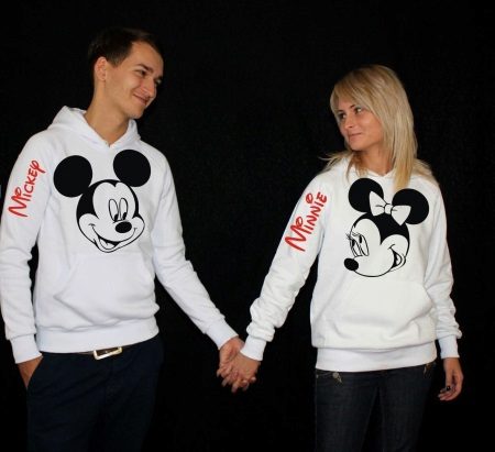 Lovers can find sweatshirts with couple characters from cartoons or movies, such as Mickey and Minnie Mouse.