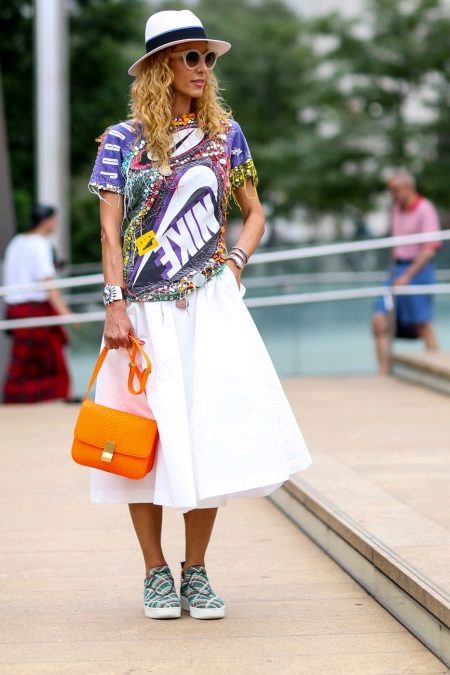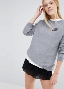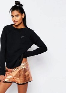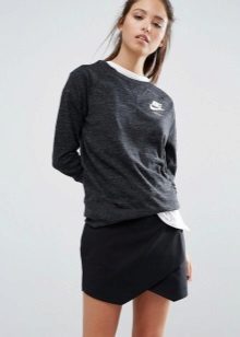 Modern women of fashion do not limit themselves to trousers, they like to wear a sports sweatshirt with skirts of various styles, the most popular is a strict mini.