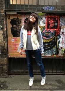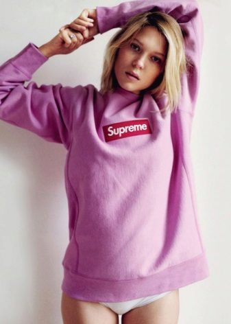 Since most of the brand's models are long, you should take note of the combination of sweatshirts with tight jeans, leggings or short shorts. It is possible a combination with miniskirts or, if a sweatshirt is more traditional, with floor-length flying fabrics. You can wear a shirt under it. From shoes, not only sneakers and sneakers are suitable, but also boots or platform shoes.
