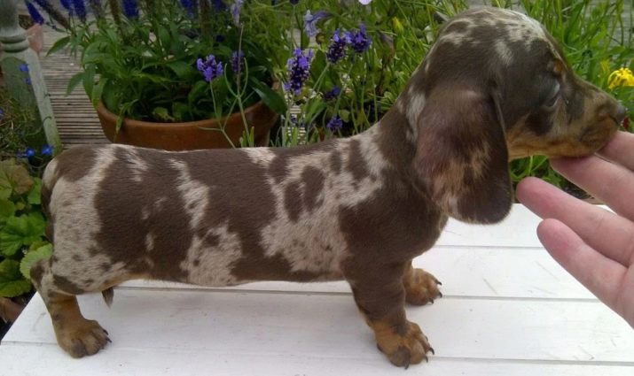 - Marble dachshunds. The main color in marble individuals is black, gray or brown. Animals look unusual and very attractive. A pattern of medium-sized chaotic spots forms on the dog's body. Spots can be gray on a black background, wheat and dark brown on a grayish background.