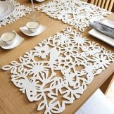 Products can have a single form for several people. For example, it can be cruciform with a common middle. Such modifications can be placed under the plates on a small table. Other products are more like strips that are used as practical and decorative, decorating them with a table for a gala reception. In addition to plates, they put spoons, knives, forks, put cups. Others are often complemented by coasters for teapots.