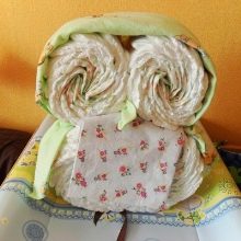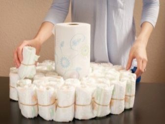 - A roller is made from one diaper, which is fixed with a regular tape. The roller base is installed on the table, and around it the rest of the diapers are placed in a circle.