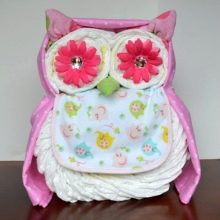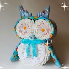 The diaper is fixed with a tape in the middle of the owl, separating the head and body. It is tied with a bow for beauty, and in this case, between the muzzle and the body, you need to place a bib, which will become the front of the owl, and a small twisted piece of fabric is the future nose. Artificial flowers should be used as eyes, which are fixed with hot glue. Additionally, you can make a gift bow.