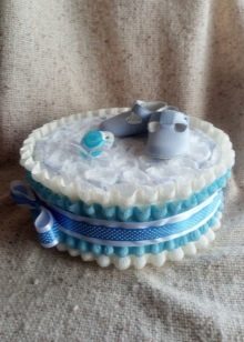 - You can completely wrap it in a beautiful multi-colored diaper, wrap it with a bright ribbon and tie it with a bow. At the top, small baby booties or a soft toy are attached, which will be a great decoration.