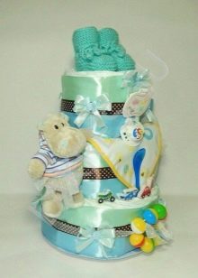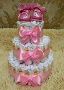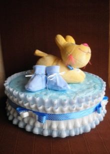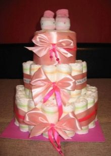 You can attach a soft toy or baby booties to the top layer. They do this with ordinary pins, because then they can be easily removed and do not spoil the diapers. To decorate the top will also help a beautiful large bow, which is made of multi-colored ribbons matching each other in color with a glue gun.