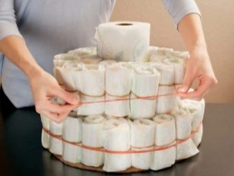 When these steps are behind, you can safely proceed to the assembly of the cake. To do this, each diaper is folded with a small roller and fixed with threads, after which the tube is glued to the base in the middle. Already to it in a circle gradually attach the diaper rollers so that they fill the entire base in several circles.