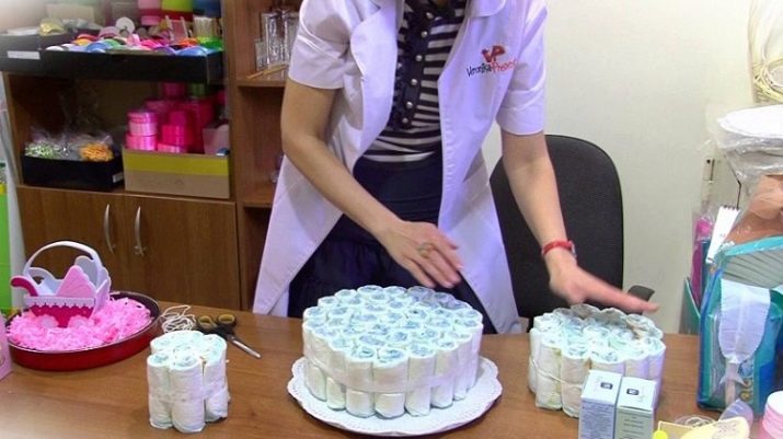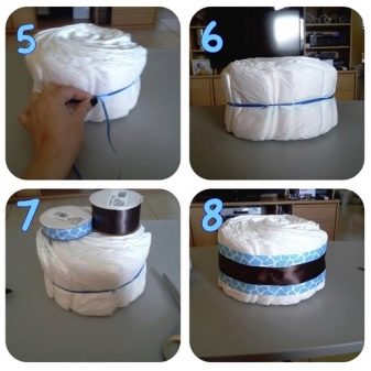 There is another way how to make such a cake. To do this, all the diapers are twisted with a small roller, and then one is placed in the middle, and the rest around it, thus forming a round base. The base is fixed with a wide ribbon, on which another thinner one is attached, which results in a cake that is quite similar to the real one.