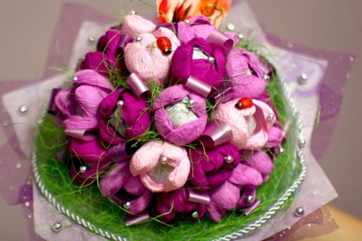 If the bride loves sweets, a beautifully decorated basket with flowers, cakes and sweets will cause her a lot of positive emotions. Another delicious set includes jam, honey, fruits and berries.