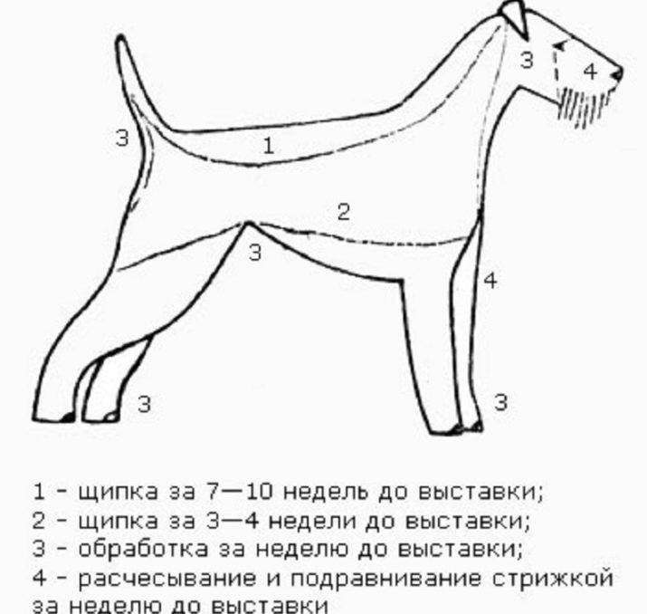 In adult wire-haired dogs, it is necessary to trim the chest, sides, ears, cheeks, back and neck to the maximum. It is also important to pluck the wool on the pads and between the toes. On the hind limbs, the hair is left up to the knees, but the muzzle should retain the specific squareness characteristic of terriers, so regular trimming of attributes such as eyebrows, beard and mustache is required. Of course, there may be some slight deviations based on the characteristics of the exterior of each animal.