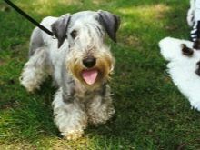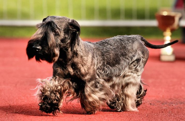 According to the standard, scotch terriers grow no more than 28 centimeters in height and do not gain weight more than 10.5 kilograms. Outwardly, these dogs resemble Giant Schnauzer puppies, however, in this case, a dense and fairly strong body is located on very short limbs with large paws. The head of the scotch tape is quite large, but proportional to the body, the eyes are oval, small in size, the ears are also not particularly large - triangular and upright. A distinctive feature of the breed is precisely the stiff coat, which forms a characteristic beard and mustache on the face, as well as expressive and lush eyebrows above the eyes. Due to the short length of the limbs, the hair of these dogs is lowered to the ground.