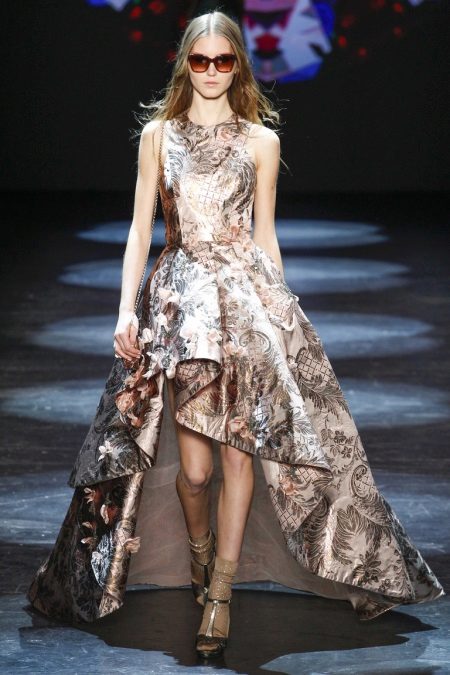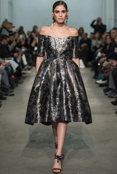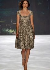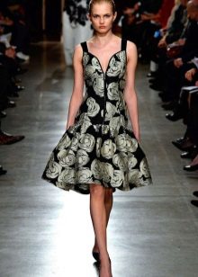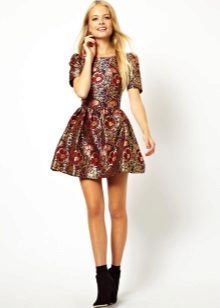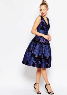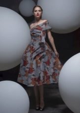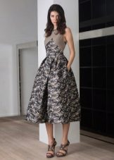 The most fashionable silhouette is a modified new look, for which jacquard fabric is ideally suited. A short fluffy skirt and fitted top allow you to emphasize all the advantages of the figure. At the same time, such a silhouette of the dress still looks very festive and solemn.