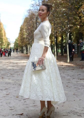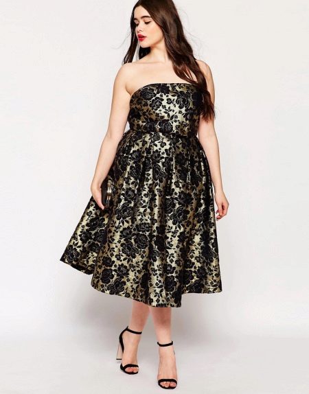 Young girls who like jacquard fabric most often choose midi length. It is suitable for a special occasion, as well as for every day. They can be strapless or with a sleeve ¾, a “tulip” style or a case, and have a high waist.