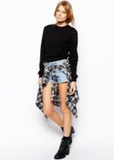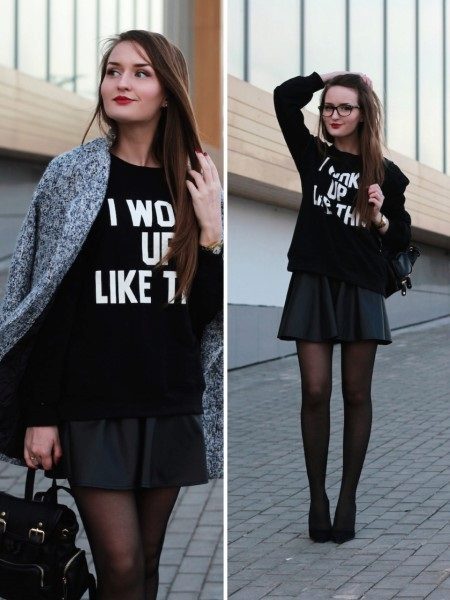 You can create a fully monochrome image. A black sweatshirt with a white inscription looks great with a black sun skirt, as well as black tights and stilettos on the tone of a sweatshirt. Add a small backpack to your shoulder to add style to your look.