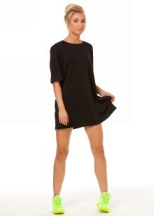 A black sweatshirt dress with a hood is very popular among young people. It can be worn over a gray t-shirt. Black tights will add elegance to the look. Do not forget about accessories! Black glasses, a watch and a handbag will perfectly complement a fashionable bow.