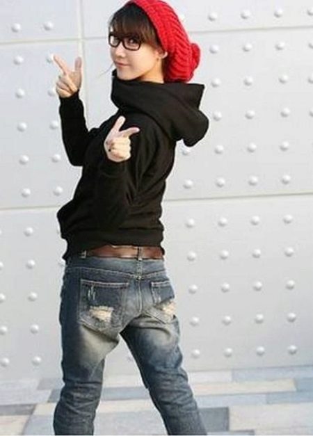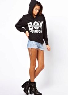 A black sweatshirt with a hood is both a universal and individual thing. She does not emphasize the image, but emphasizes other elements of the bow. For example, against the background of a black sweatshirt, ripped jeans, a beautiful skirt or bright leggings look more spectacular.