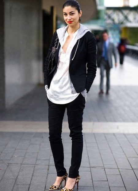 To create a feminine look, an excellent ensemble is a black sweatshirt with a gray inside and a hood over a snow-white blouse with black tight-fitting jeans and leopard-colored high heel shoes. A small black shoulder bag will be the final element of a beautiful bow.