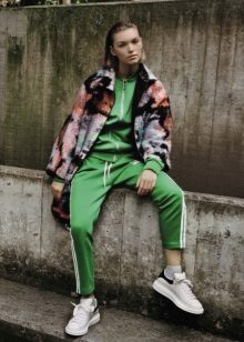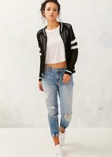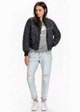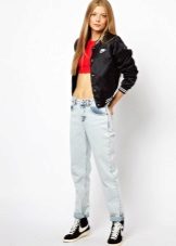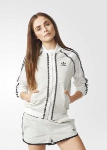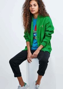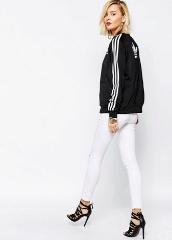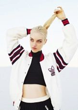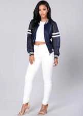The Olympic jacket will look great with a pencil skirt or jeans. This is especially true for tight, slightly shortened models. As shoes, you can choose sneakers or ankle boots with massive heels.