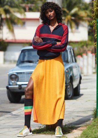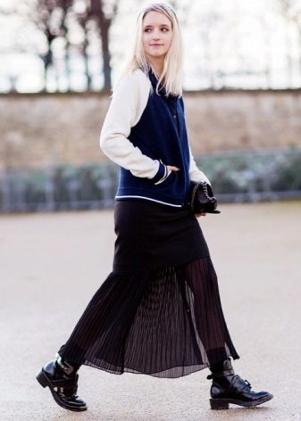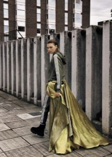 Another fashion trend is a sweatshirt with a romantic skirt on the floor. This combination at first glance seems unexpected, but dressing like this, you will certainly be the most stylish. Be sure to choose shoes without a heel to this outfit.